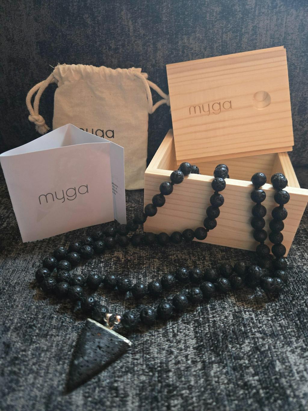 Can be used as a necklace or bracelet. Made with Lava stone encouraging calmness and ridding of unhealthy emotions. Came in a lovely wooden presentation box with a card that gives you insight into the origins and benefits of the stone. I would definitely recommend. I love it.