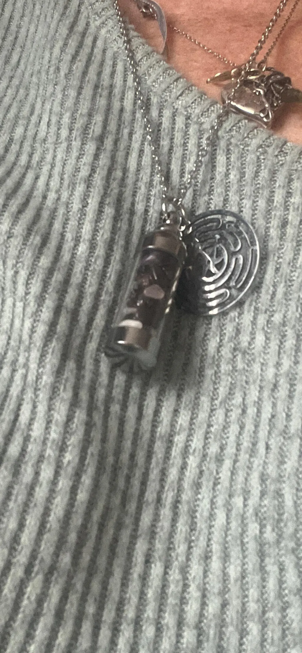 Our Hecate Spell Jar Amulet Necklace contains a powerful blend of black tourmaline, obsidian, moonstone, garnet, and amethyst, each chosen for their connection to Hecate.